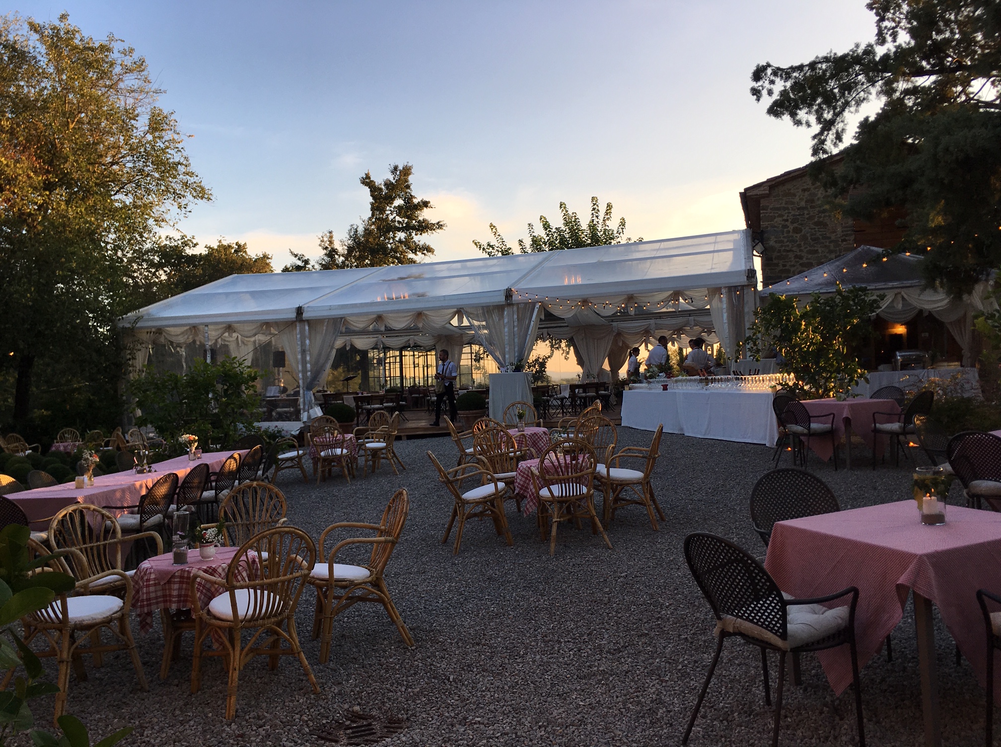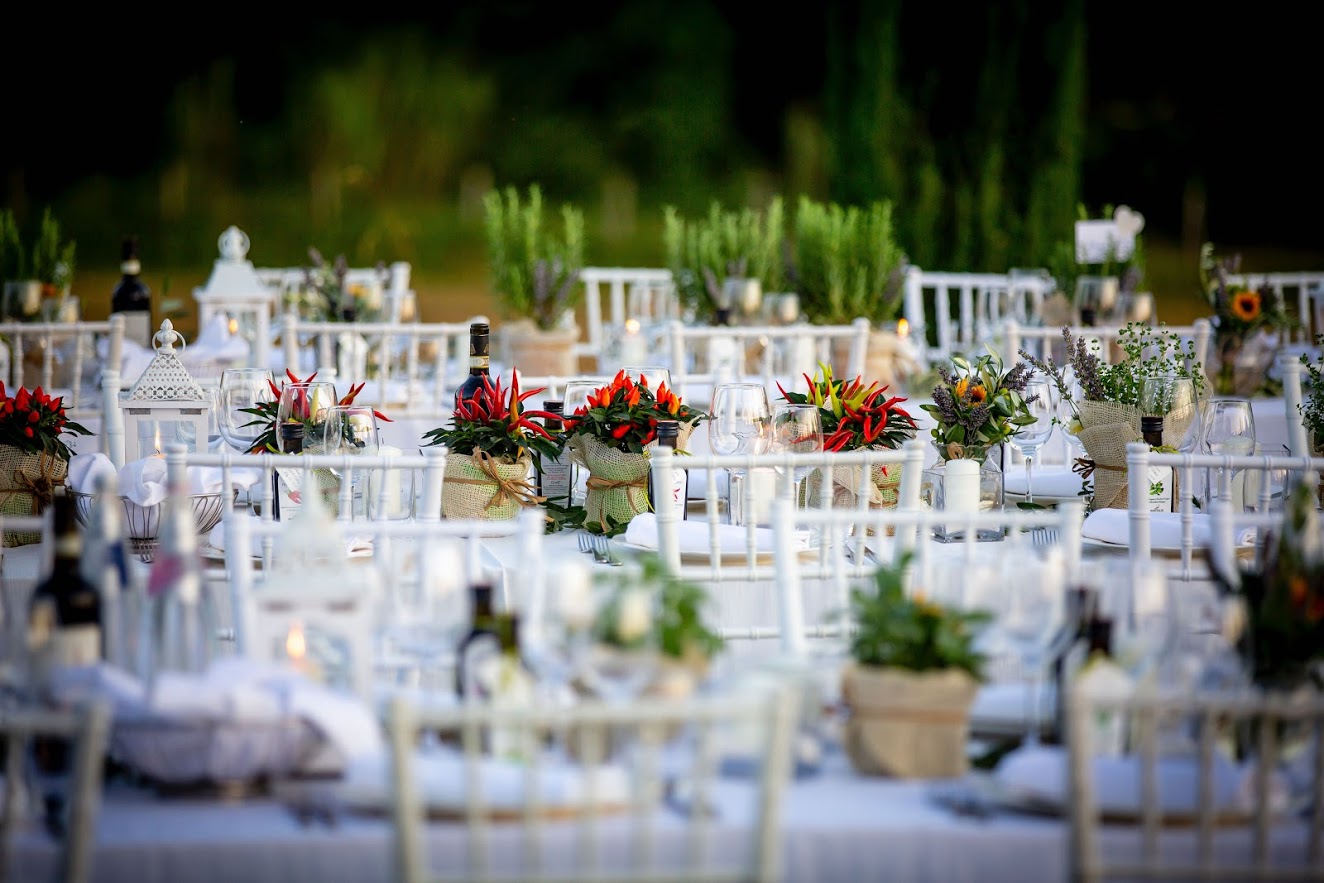 Elaine and Nicolas's wedding was an international event. It brought together guests from different corners of the world. This gathering added a truly cosmopolitan atmosphere to the celebration. The couple decided to host their wedding at the groom's parents' vacation home. This home is nestled in the picturesque Arezzo countryside. It provided a charming and idyllic setting for the festivities. The hilly landscape posed a delightful challenge. Custom elements were created, including a dance floor and musician platform that elegantly adapted to the natural topography. There was a chic powder room reflecting the couple's discerning taste.