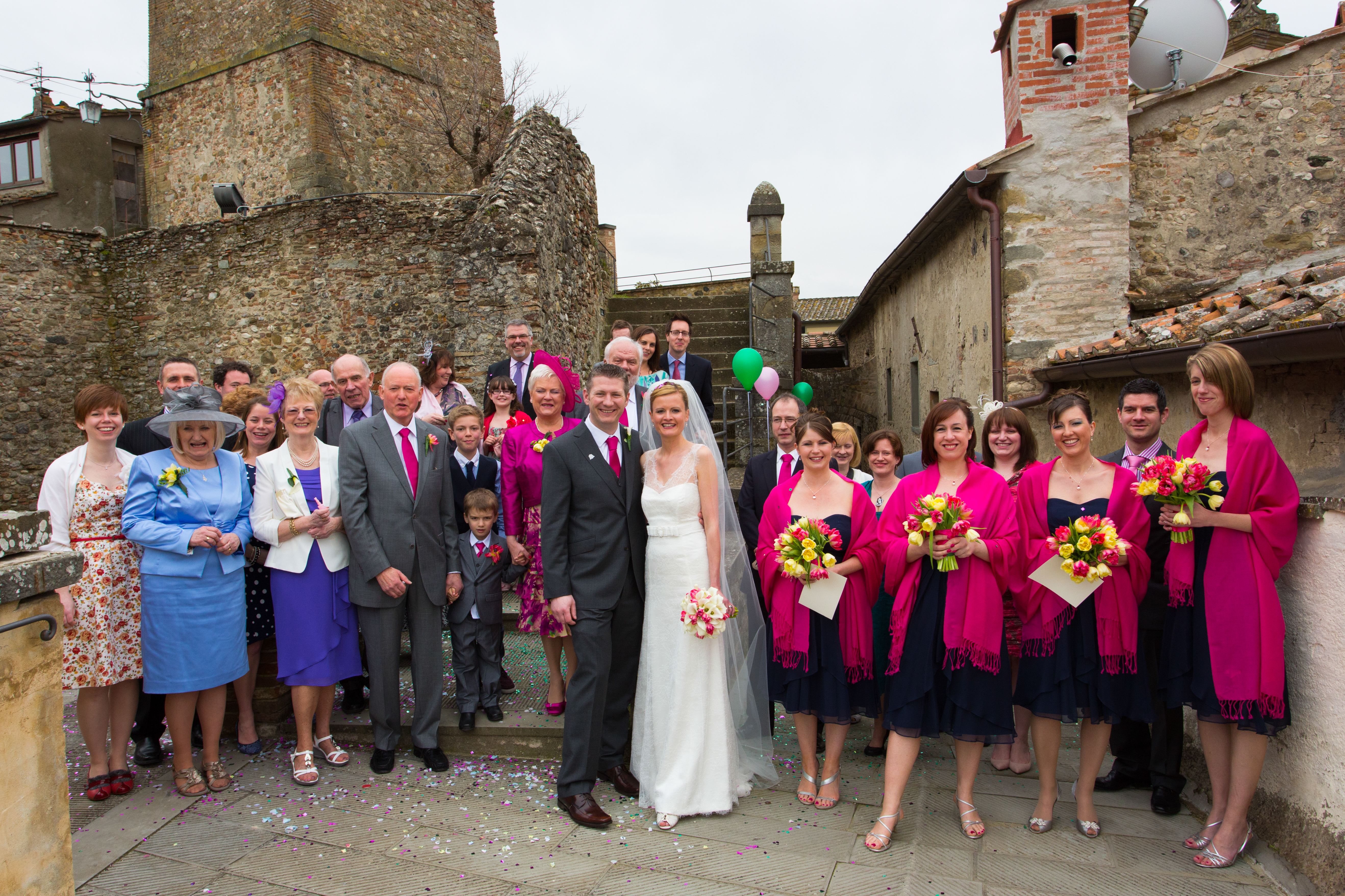 "When we decided that we would like to get married in Italy we really did not know where to start. We feel so, so fortunate to have been put in contact with Rose Bonesse. We explained to Rose the type of wedding we wanted, something rustic and relaxed with a place for our friends and family to stay. The venue Rose found us was more than perfect, it was everything we could have wished for and more. We both agreed that it was fundamental to us that the organisation of the wedding would not become stressful. I remember Rose saying that it was her job to ensure that we did not feel like that, especially on the wedding day. Rose was fantastic at replying to our e-mails and made the whole process extremely smooth. Lots of people asked us how on earth we would organize a wedding in a different country. Rose explained everything that we needed to do, she checked any forms that needed to be completed and found out all of the information we needed. I can honestly say that we felt completely relaxed, calm and content on the days leading up to and including the wedding day. Feeling like that made enjoying the day from start to finish even more enjoyable and special. Although we tried to learn as much Italian as we could before the wedding day it did not quite stretch to the fine details of liaising with the photographers, hairdressers, beauticians, Mayor etc. So Rose kindly supported us and accompanied me for trials and the hairdresser and beautician, ensuring that we were happy with everything. Rose’s attention to detail was amazing, she added fantastic surprises to the wedding day, decorating the room for the ceremony with beautiful ribbon and organizing exploding confetti (making for a very interesting photo!) She and Carlo worked so incredibly hard on our wedding day and dedicated themselves to ensuring it was perfect for us, even down to finding me a cushion for my chair at the reception so I was really comfortable! However they remained in the background, never demanding anything of us and always making sure that the day ran exceptionally smoothly. This is quite a feat in a country where nothing happens on time….but the beauty of Italy is everyone adopts a more relaxed attitude to time. All of our guests continue to talk about the fantastic time we all shared and quite a few (including us) are planning a return trip. The hospitality shown to us by the owner of the reception venue could never be repaid. Quite a few of the guests (children and adults) learnt how to make pasta a couple of days before the wedding at the reception venue and so this was used for one of the courses for the wedding day meal. The food and wine were exceptional and unforgettable. We ate from 6:30 pm until midnight and then danced into the early hours! We had a day that far exceeded our hopes and dreams. The venue for our wedding, the reception and the people will always hold a very special place in our hearts. Rose made it all possible and we will always be grateful for such a fantastic start to our married life."
